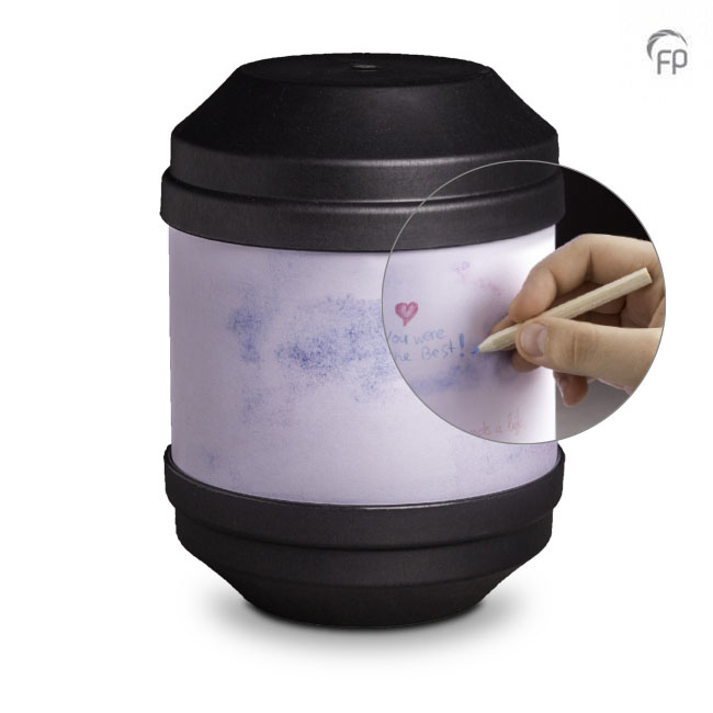 Im Lieferumfang der Urne sind Buntstifte enthalten, um dem geliebten Menschen eine letzte Nachricht zu hinterlassen.